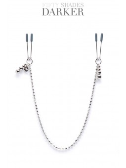 Parfait accessoire de vos jeux BDSM, "At my mercy" est un jeu de petites pinces à tétons avec chaine en métal, par Fifty Shades Darker.